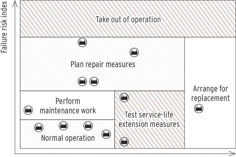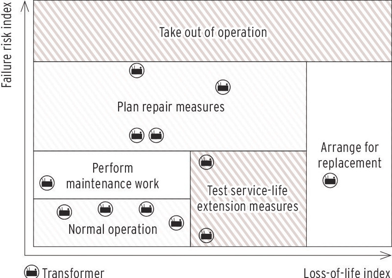 这也是为什么 Reinhausen 开发了一种基于变压器状态,能在早期阶段识别变压器是否处于危急状态的方法:TESSA® FLEETSCAN 2D。该系统基于一个二维评估矩阵。首先,功能失败的可能性被计算在其中,以便对变压器群组的可靠性进行建模。第二个维度则考虑到使用寿命损失,这对于做出长期投资决策来说十分重要。