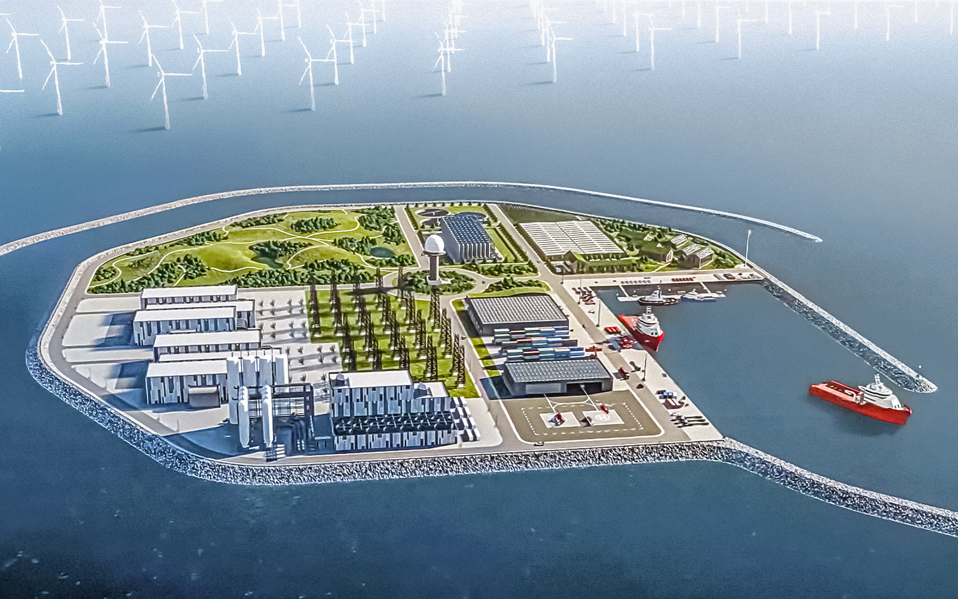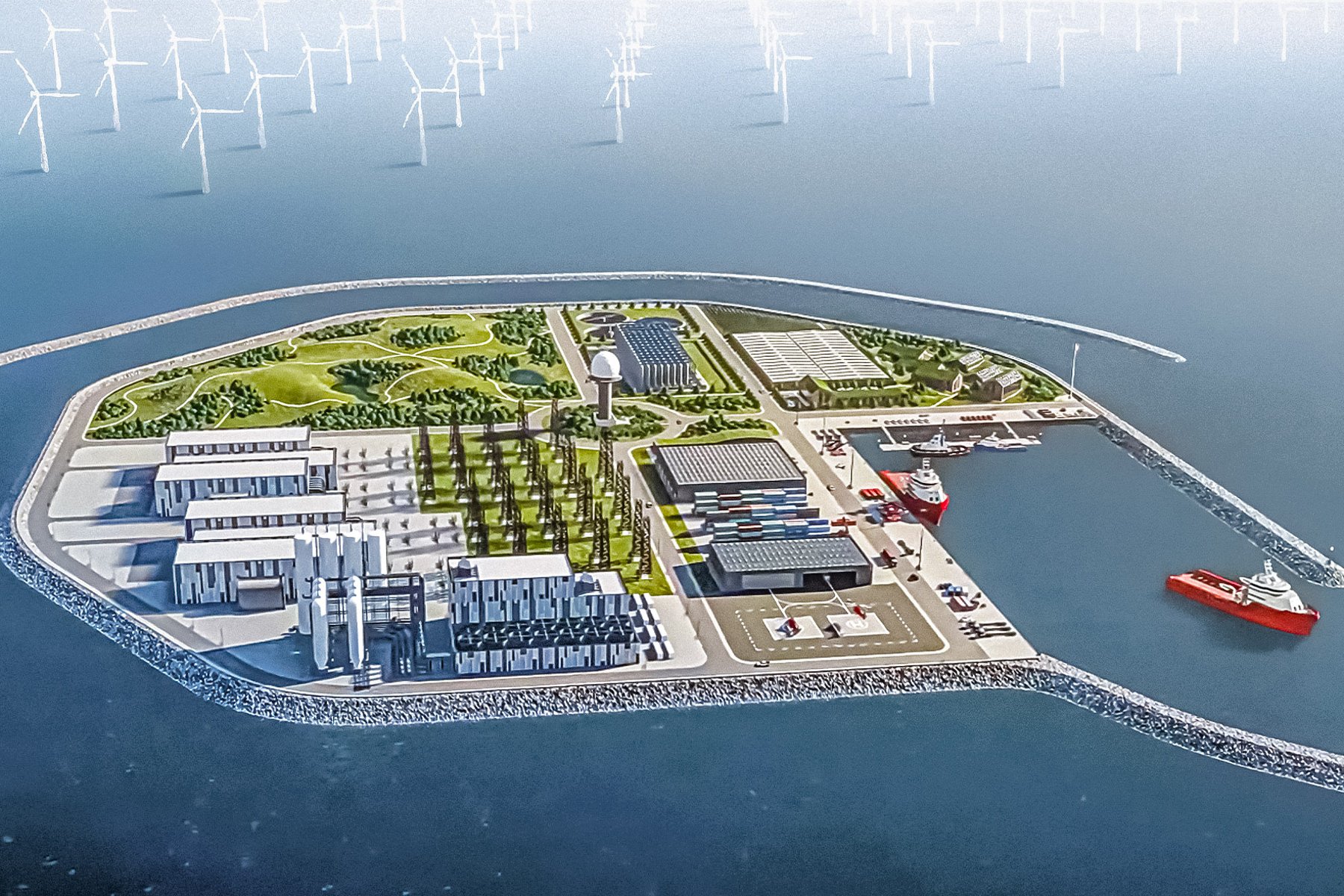 Converter stations which convert the alternating current into direct current for low-loss transmission via submarine cables, would be located on the islands. There would also be space for the storage of spare parts as well as accommodations for maintenance personnel. Other possible uses are also conceivable such as electrolysis plants which could convert surplus electricity into hydrogen directly on site. The operation of data centers would also be conceivable.