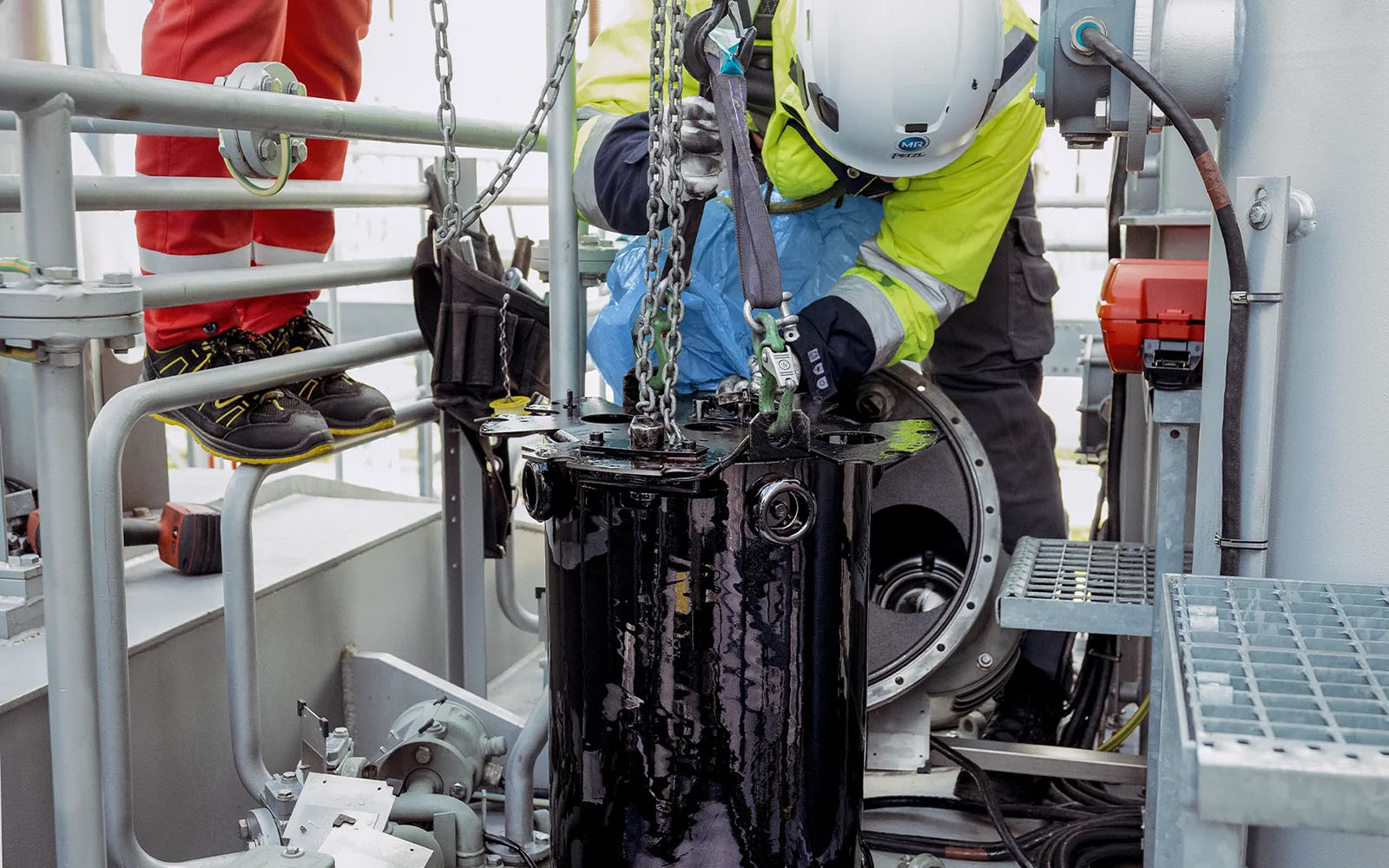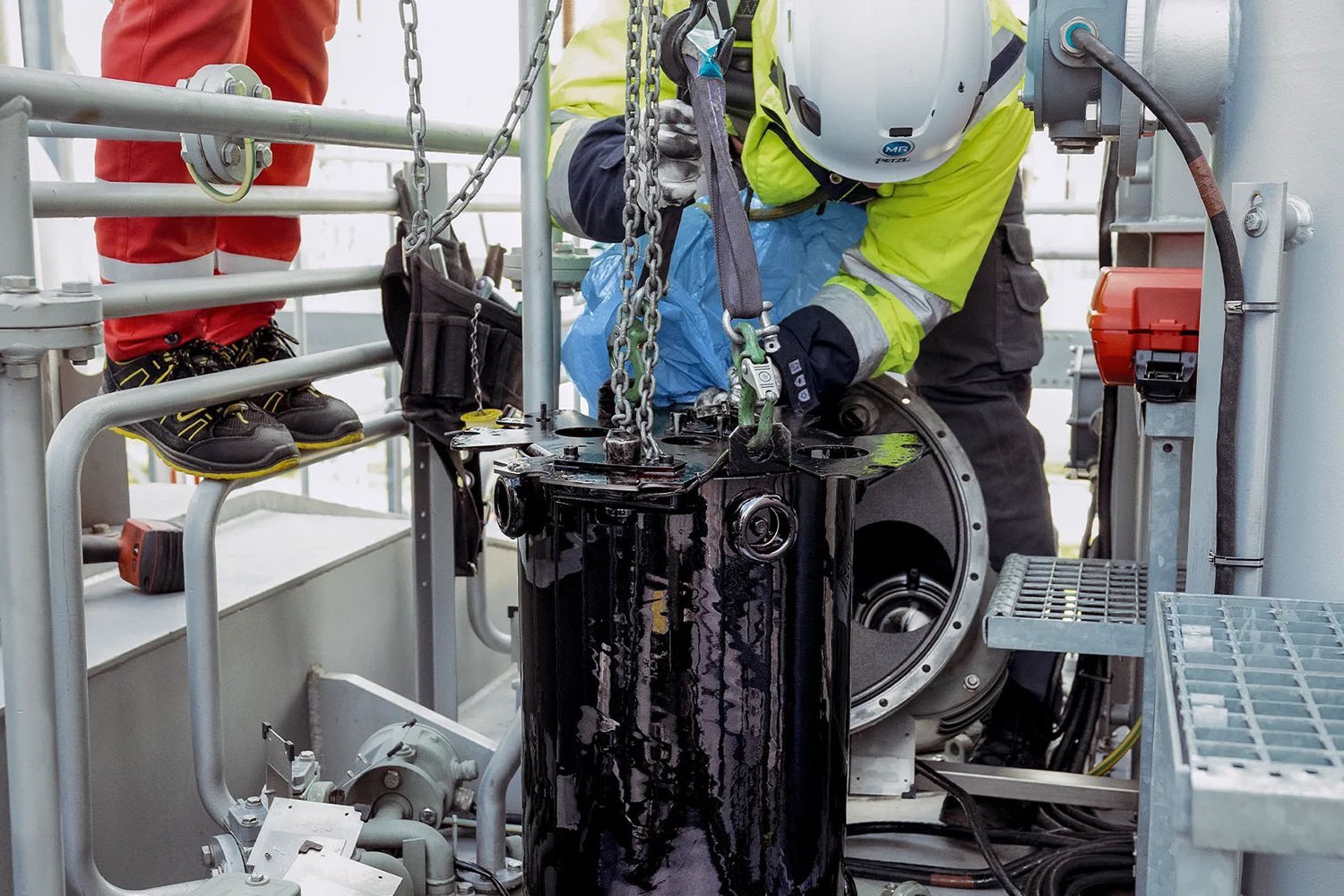 Als Christoph und Andreas bei ČEPS in Hradec eintreffen, steht der zu wartende Transformator nicht mehr unter Spannung. Nachdem sie das Isolieröl abgelassen haben, heben die ČEPS-Mitarbeiter die drei vom Öl geschwärzten Stufenschalter mit einem Kran aus dem Transformator. Jetzt können die beiden MR-Servicetechniker die Schalter in die Werkstatt des Umspannwerks bringen und zur Tat schreiten.