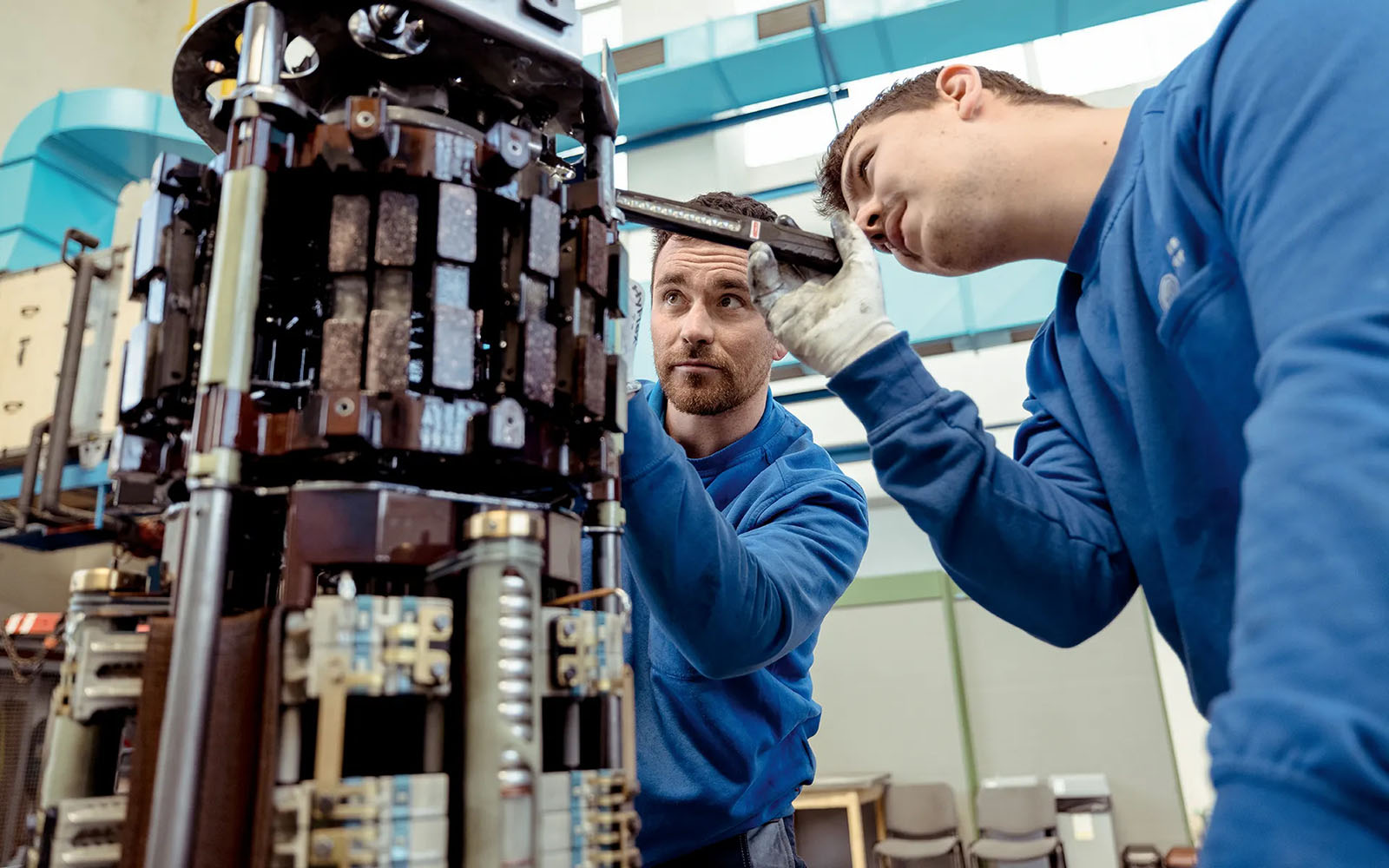 In der Werkstatt gehen die Servicetechniker jetzt geübt alle notwendigen Schritte durch. Christoph kennt die Schalter so gut wie im Schlaf. „Unsere Produkte sind auf maximale Effizienz getrimmt. Da ist kein Schräublein zu viel, jedes kleine Bauteil hat seine ganz bestimmte Funktion. Wer die nicht kennt, kann ich das Teil nicht pflegen.“ Nach der äußeren Reinigung messen er und Andreas zunächst Werte, (Widerstände, Energiespeicher, Kontaktabbrand, Kontaktbrückenspiel, Hauptkontaktaufschaltung). Dann bauen sie die Schalter auseinander und reinigen alle Komponenten von Öl und Ruß.